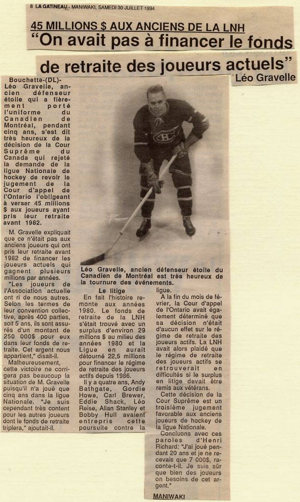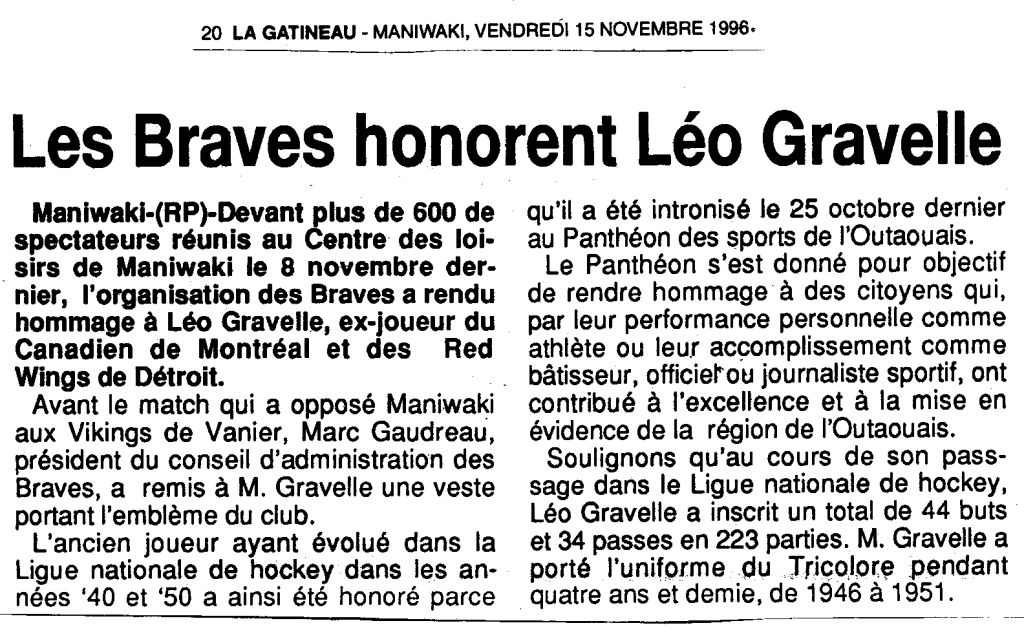 Les Braves honorent Léo Gravelle - Article La Gatineau - Maniwaki -15 novembre 1996