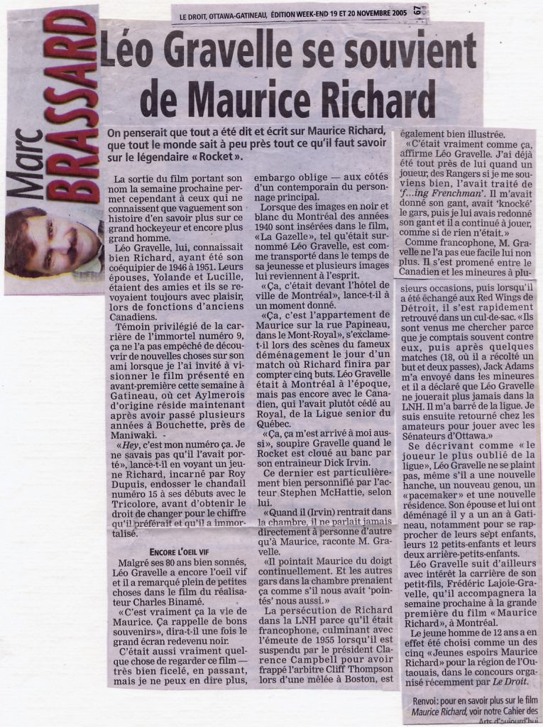 Léo Gravelle se souvient de Maurice Richard - Article de Marc Brassard Le Droit 20 novembre 2005